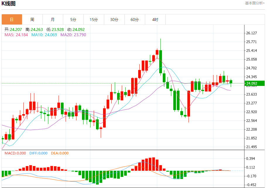 现货白银:截止北京时间21:20,现货白银下跌,现报24.097,跌幅0.43%。纽市盘前,白银价格自上午以来一直在窄幅波动,因此,今天预期的看涨趋势没有改变,这取决于价格稳定在23.70水平以上,提醒您我们正在等待突破24.60,以确认反弹至25.50作为下一个主站。