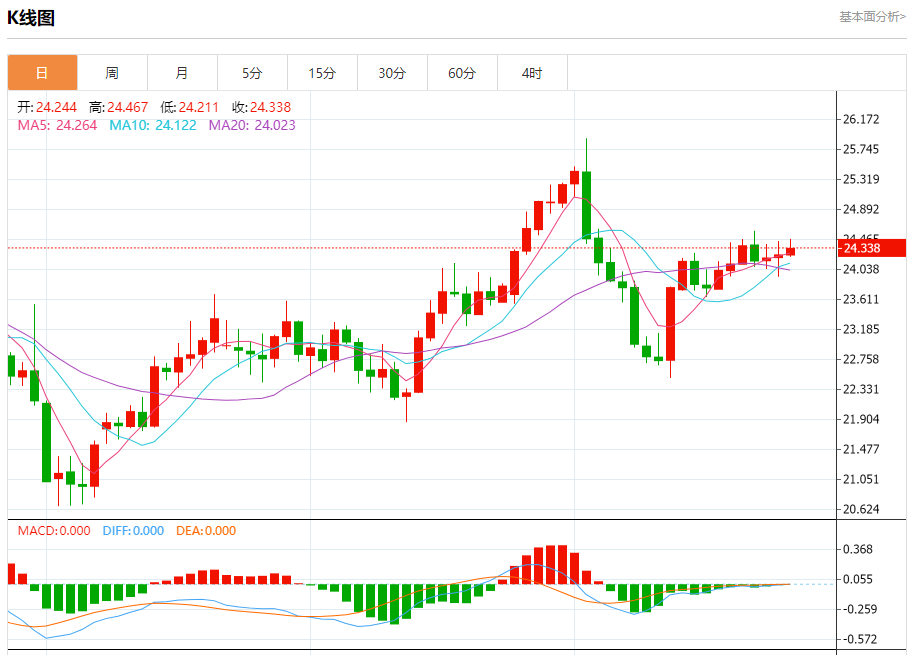 现货白银:截止北京时间21:20,现货白银上涨,现报24.347,涨幅0.42%。纽市盘前,白银价格从早上开始在横盘轨道内波动,注意到随机指标失去了积极的动力,这可能会推动价格在返回上涨之前提供一些暂时的看跌倾向。