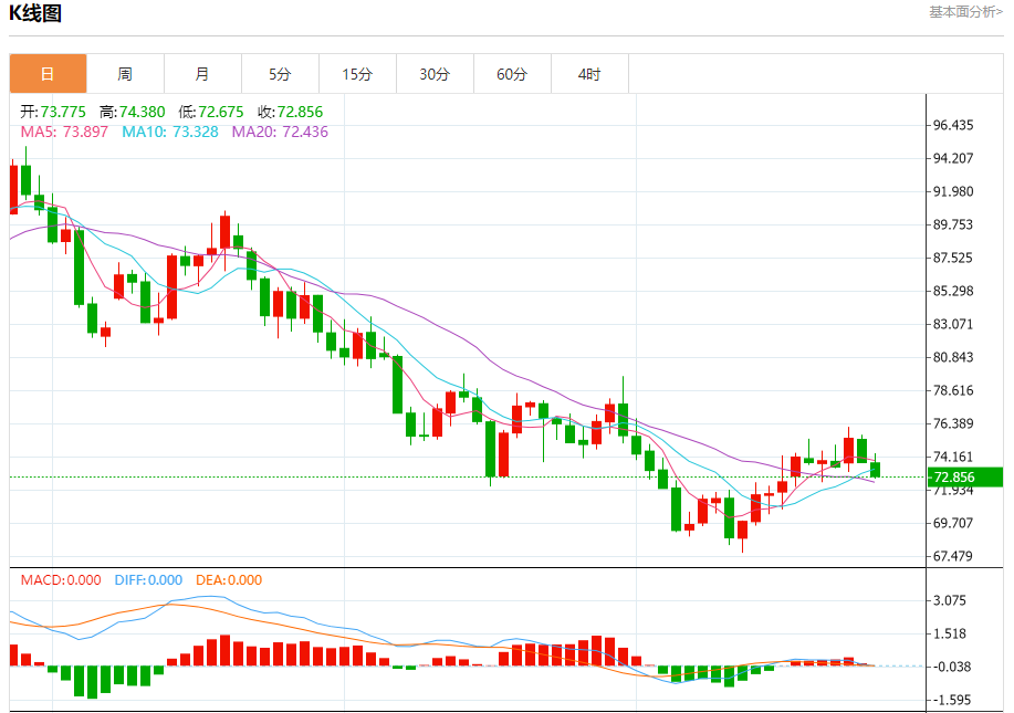 原油市场:截止北京时间21:20,美油下跌,现报72.801,跌幅1.35%。纽市盘前,原油价格现在交易为负,以压制关键支撑73.73,这促使人们在即将到来的交易中保持谨慎,因为价格需要在该水平上方盘整,以保持今天的看涨趋势,其下一个主要目标位于77.86。