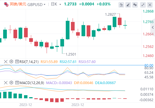 英镑:截止发稿,英镑/美元徘徊于1.2733附近。上周五英镑/美元下跌,收报1.2723,跌幅0.07%。英国全国房价年化数据进一步回落于预期,截至12月的年度数据为-1.8%,而预期为-1.4%。市场预计,从上一时期的-2.0%开始,经济将出现更健康的反弹。英国经济数据的下降正在限制英镑,英镑在很大程度上受到美元大盘抛售的支撑,因为市场押注美联储(Fed)将在2024年更快、更大幅度地降息。技术面上,汇价上行的初步阻力位于1.2802,进一步阻力位于1.2872,关键阻力位于1.2917;汇价下行的初步支撑位于1.2687,进一步支撑位于1.2642,更关键支撑位于1.2572。