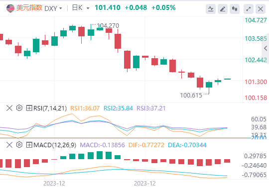 美元指数:截止发稿,美元指数交投于101.41附近。美联储的鸽派立场,欢迎通胀数据降温,排除了2024年加息的可能性,并预测将有75个基点的宽松政策,最近推动了美元对风险较高资产的需求。就目前而言,市场预计3月将降息,5月将进行额外调整。本周,美国将公布关键的劳动力市场数据,这将有助于投资者为美联储的下一步决策下注。技术面上,美元日线图上的指标主要反映了看跌情绪。由于该指数远低于20、100和200天的SMA,空头似乎在更大范围内控制了局面。接近超卖条件的RSI进一步强调了这一点,这与整体指数的看跌前景一致。MACD显示红色条线上升,表明抛售压力略有上升。对于希望在这种超卖市场条件下抓住机会的反向投资者来说,这可能会引发一个保守的买入信号。