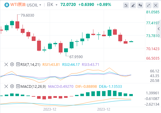 周二亚盘,原油交投于72.07附近。美国原油库存报告喜忧参半,美国石油学会(API)报告增加,而能源信息署(EIA)报告的降幅大于预期。2024年欧美降息的可能性可能会影响WTI等以美元计价的大宗商品。这种情况和即将发布的芝加哥采购经理人指数(PMI)数据预计将影响WTI价格,这可能会影响美国石油、英国石油和天然气价格,因为它们在全球能源市场中具有相互关联的性质。