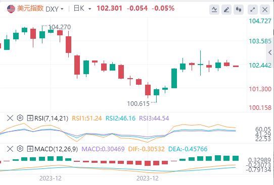 美元指数:截止发稿,美元指数交投于102.301附近。美元周三小幅下跌,在美元指数中跌至102.4,市场参与者坚持观望,等待驱动因素。交易大厅相对平静,没有任何重大报告在交易时段引发反应。焦点是定于周四公布的12月美国消费者价格指数。目前,市场押注2024年五次降息,基本上否定了美联储(Fed)仅75个基点的宽松预测。美国经济强劲的劳动力市场数据在很大程度上被疲软的美国ISM采购经理人指数所抵消,因此12月的CPI读数将在形成对央行宽松日历的预期方面发挥重要作用。技术面上,美元指数的RSI目前正处于正斜率,暗示着强劲的购买势头。MACD显示了上升的绿条,这进一步证实了这一点,这加强了该建筑的看涨势头。在日线图上,有迹象表明多头正在逐渐收复地盘。然而,转向SMA,在更广泛的范围内,它们提供了一个稍微矛盾的前景。尽管该对盘整在20日均线上方,支持了短期看涨观点,但仍位于100日均线和200日均线下方。这种布局表明,尽管短期内出现了牛市,但空头仍然掌控着整体趋势。