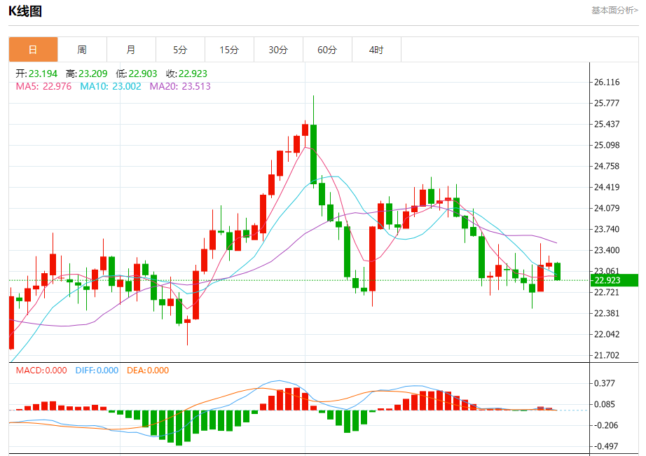 现货白银:截止北京时间21:25,现货白银下跌,现报22.938,跌幅1.11%。纽市盘前,白银价格正在测试23.00支撑线,暗示将在即将到来的交易中恢复负面交易,但我们的中立态度仍然有效,直到价格确认突破这一支撑或突破23.70阻力以明确检测下一个目标。