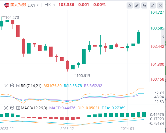 美元指数:截止发稿,美元指数交投于103.336附近。美联储的克里斯托弗·沃勒(ChristopherWaller)发表了鹰派言论,他指出,实现2%的通胀率并不像预期的那么容易,并打算在2024年只降息三次。市场预计美联储的宽松周期将于3月开始,随后在5月再次降息,这可能会限制美元的任何上行空间。尽管CPI数据较高,但市场仍然固执,并预计美联储将尽早启动宽松周期,而疲软的PPI数据使市场有理由押注不那么激进的做法。技术面上,RSI在正区域显示出正斜率,表明看涨势头正在增加。MACD通过上升的绿色条线证实了这一趋势,表明购买压力正在增加。该资产位于20天SMA上方,进一步强调了持续的看涨控制——这是短期走强的标志。相反,该指数低于100天和200天SMA的位置描绘了总体看跌立场。这一立场表明,尽管短期看涨,但卖方仍然拥有更广泛的市场控制权,买方必须重新获得100天均线才能开始考虑上行趋势是逆转。