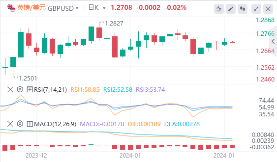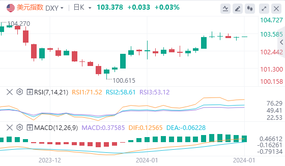 美元指数:截止发稿,美元指数交投于103.378附近。美国经济依然强劲,数据持续坚挺,表明第四季度可能增长,2024年第一季度可能保持稳定。关于美联储,市场预期已经调整,市场预计2024年将放松约125个基点(bps),而此前预期为近175个基点,1月初美元上涨。核心个人消费支出(PCE)可能会影响美联储的短期预期,并将于周五公布。技术面上,RSI处于平坦和积极的区域,暗示在当前的市场动态中采取中立立场,而不是明显倾向于买方或卖方。与MACD 的平坦绿色柱线配对,这表明美元有轻微的看涨势头在等待,尤其是因为它意味着卖方市场正在缩小。美元相对于SMA的定位提供了更详细的市场趋势图。高于 20 日均线的存在表明买家在短期内拥有基本控制权。然而,美元指数低于 100 日和 200 日均线的位置表明,从长远来看,卖家占据主导地位。