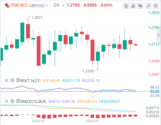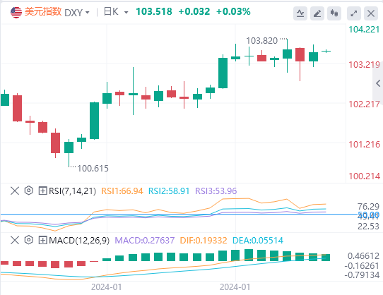 美元指数:截止发稿,美元指数交投于103.518附近。美元指数在关键经济活动发布后上涨0.30%,因为美联储(Fed)近期降息的情况继续失去相关性。美国经济再次显示出韧性,第四季度GDP强劲增长3.3%。美联储的激进加息成功地缓和了通胀,而没有造成重大的经济痛苦。尽管经济势头放缓,例如家庭储蓄率下降和职位空缺减少,但整体强劲的产出提振了市场信心。技术面上,日线图上的指标反映了相对中性的立场,略带看涨倾向。RSI在正区域显示出正斜率。这通常预示着上升势头,表明目前购买压力更大。MACD指标显示平坦的绿色条形,表明之前的上涨势头正在暂停,但买家仍然存在于市场中。通常,平坦的MACD处于正区域通常被视为下一次上涨之前的盘整阶段。