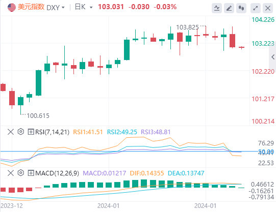 美元指数:截止发稿,美元指数交投于103.031附近。由于周四公布的疲软劳动力市场数据盖过了强劲的ISM采购经理人指数。市场仍在消化美联储主席杰罗姆·鲍威尔(JeromePowell)周三的言论,这帮助该指数跃升至103.80。美联储鲍威尔主席重申,尽管市场猜测持续,但3月份降息的可能性不大。尽管如此,他指出,利率调整仍然主要取决于数据,即将到来的就业数据决定了美元的步伐和短期预期。技术面上,日线图上的指标反映了短期内抛售势头的暂时主导地位。RSI虽然处于负斜率,但仍处于正值区域,反映出购买势头减弱。MACD指标进一步支持了这一点,该指标显示绿柱线减少,这表明抛售压力正在缓慢增加。
