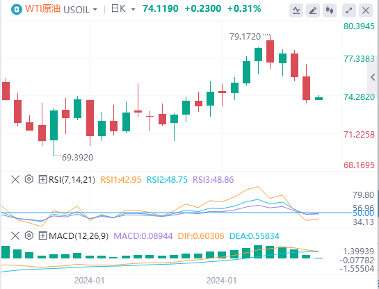 周五亚盘,原油交投于74.119附近。原油周四回落至每桶74.00美元左右,此前早盘飙升至79.00美元,因为市场正在寻找全球原油供应可能在全球桶需求上升的情况下开始破裂的迹象。以色列和哈马斯之间的停火谈判在卡塔尔取得进展,随着市场进入周五市场时段,能源价格趋于疲软。原油市场周三对美联储的鹰派立场不屑一顾,这打消了提前降息的希望,在石油输出国组织(欧佩克)周四宣布其宣布的2024年每天减少220万桶的产量上限不会改变后,原油被锁定在高端。欧佩克正试图支持全球原油产量的增长,这主要是由美国创纪录的产量水平推动的,能源市场因欧佩克将试图通过故意削弱全球原油需求来加剧未来潜在的供应失衡的头条新闻而上涨。