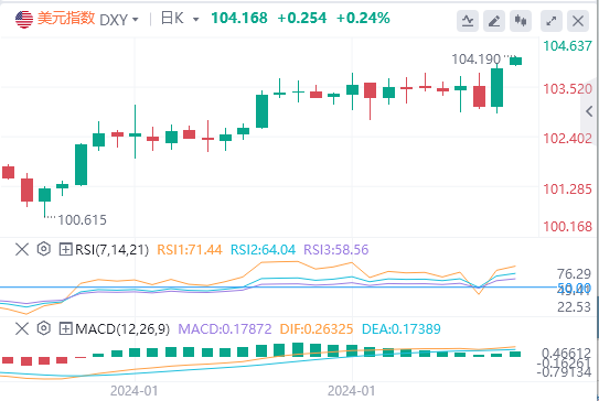 美元指数:截止发稿,美元指数交投于104.168附近。美联储鲍威尔主席重申,尽管市场猜测持续,但3月份降息的可能性不大。与此一致,他表示,该银行将监控传入的数据,以确定宽松周期的时间。由于美国劳动力市场仍然紧张,央行可能会考虑推迟降息。技术面上,日线图上的指标表明,尽管出现了一些截然不同的信号,但买盘压力占主导地位。RSI在正斜率和正区域滑行表明买盘势头正在积聚,MACD的上升绿条进一步巩固了这一点。然而,混合信号来自SMA。尽管该指数高于20日和200日均线,表明前景看涨,但仍低于100日均线,表明看跌障碍。