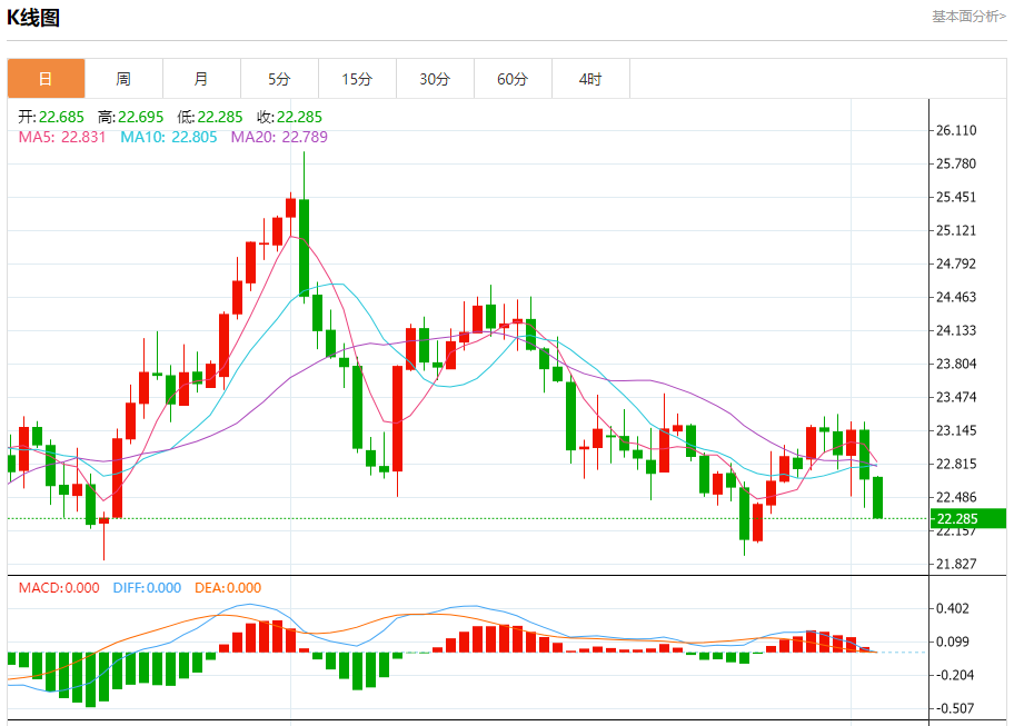 现货白银:截止北京时间21:25,现货白银下跌,现报22.287,跌幅1.69%。纽市盘前,白银价格继续下跌,接近22.25水平,似乎有可能突破这一水平,遭受新的损失,延伸至21.70,然后是21.35,以保持今天建议的看跌趋势,并受到EMA50下方的支撑,提醒您看跌浪潮的持续取决于23.00下方的价格稳定性。