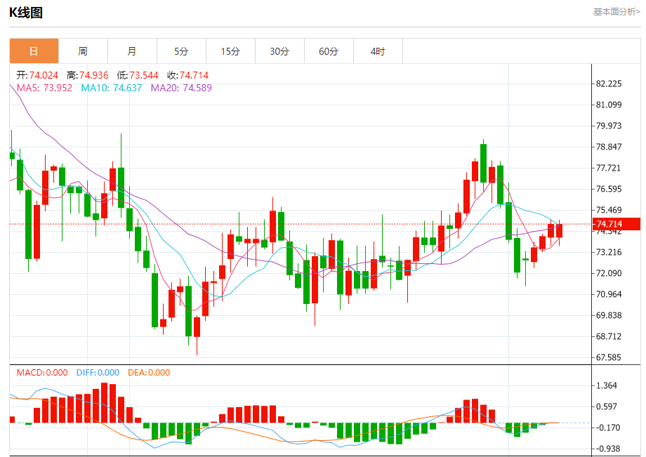 原油市场:截止北京时间21:23,美油上涨,现报74.726,涨幅0.89%。纽市盘前,原油价格测试了73.73水平,并在此水平以上保持稳定直到现在,今天保持看涨趋势情景活跃,等待超越移动平均线50,移动平均线50在74.20形成日内阻力,以缓解朝着我们从75.40开始的积极目标上涨的任务,提醒您牛市的持续取决于73.73水平以上的稳定性。