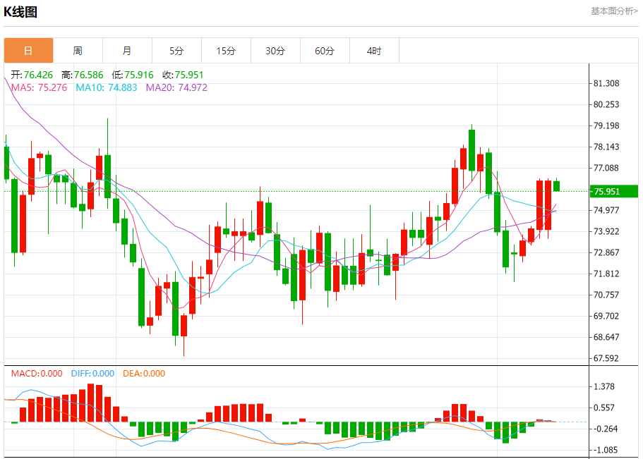 原油市场:截止北京时间21:16,美油下跌,现报75.951,跌幅0.65%。纽市盘前,原油价格在看涨通道的支撑线上方保持稳定,等待积极的动力推动价格恢复看涨波,其下一个目标位于77.86。