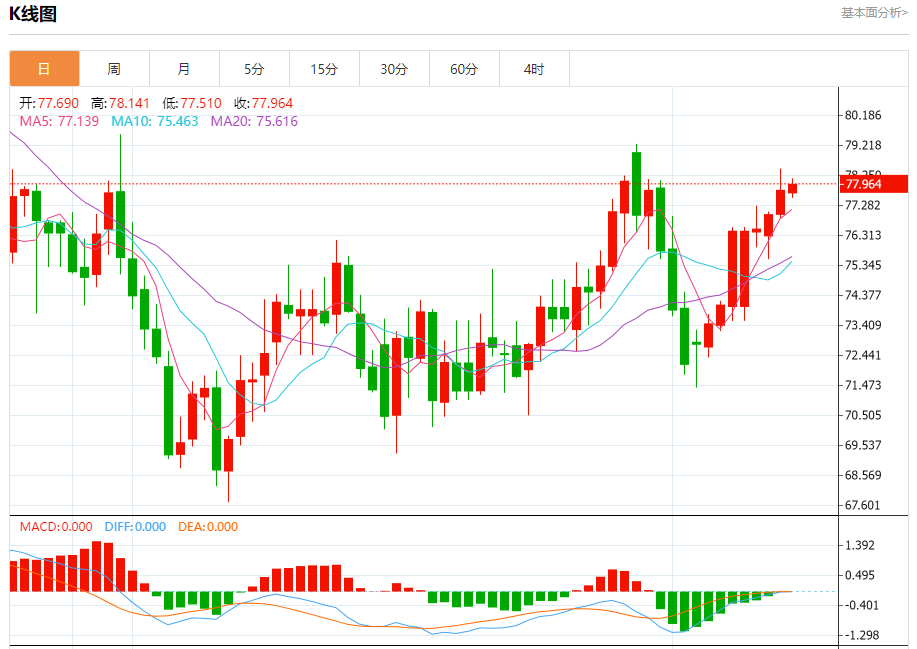 原油市场:截止北京时间21:12,美油上涨,现报77.934,涨幅0.24%。纽市盘前,原油价格首次突破77.86水平并试图保持在该水平上方,这加强了继续上涨的预期,并在日内和短期基础上延长了看涨浪潮,提醒您我们正在等待访问80.00作为下一个主要站。