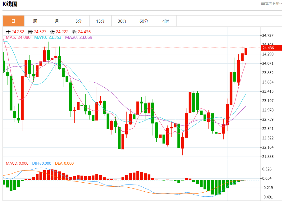 现货白银:截止北京时间21:23,现货白银上涨,现报24.438,涨幅0.55%。纽市盘前,白银价格提供了新的积极交易,以达到24.60水平的阈值,等待突破这一水平以确认牛市的延伸,并向25.00和25.50水平前进,作为下一个主要站。