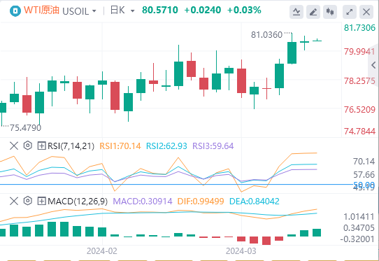 周一亚盘,原油交投于80.57附近。过去一周,石油市场大幅上涨,轻质原油期货价格达到每桶81美元以上,为去年11月以来的最高水平。这一看涨趋势受到多种因素的支撑,包括美国炼油商需求强劲和全球供应收紧。国际能源署(IEA)的最新报告进一步支持了这一趋势,自去年11月以来第四次上调了2024年的石油需求预测。这一调整表明市场趋紧,预计全球需求将增加130万桶/日。