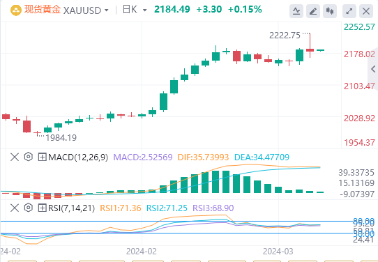周五亚盘,黄金交投于2184.49附近。金融市场在3月21日会议后继续消化美联储的鸽派立场。美联储主席杰罗姆·鲍威尔(JeromePowell)及其同事承认,经济强劲,劳动力市场正在逐渐降温,尽管通胀率从1980年代的较高水平下降,但通胀仍然居高不下。美联储官员重申,他们预计2024年将降息三次,但除非数据显示通货紧缩进程正在演变,否则政策将保持不变。与此同时,美国10年期国债收益率基准票据收复失地,而美元指数(DXY)上涨0.58%,至103.98点。