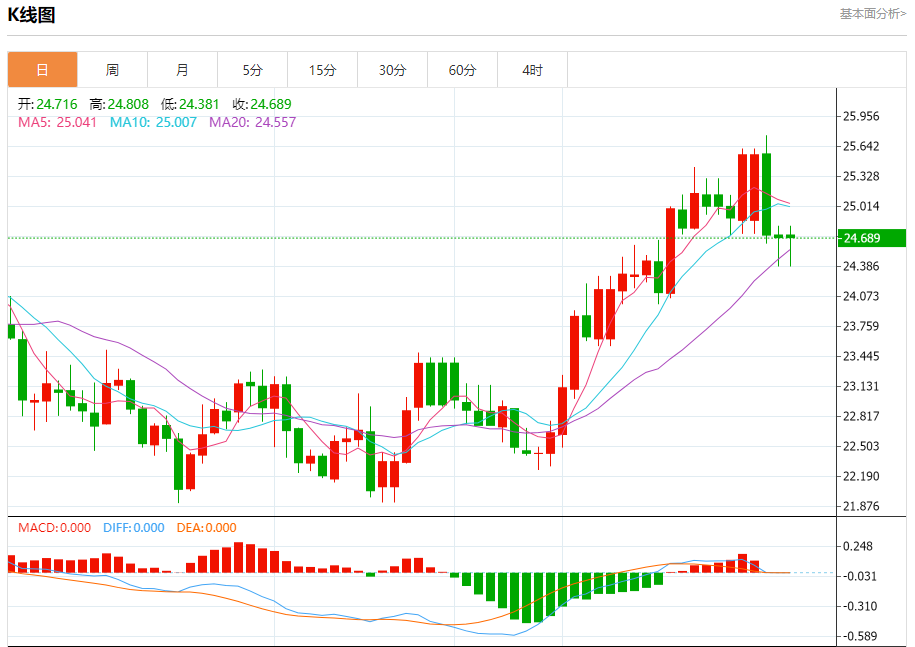 现货白银:截止北京时间20:23,现货白银下跌,现报24.689,跌幅0.10%。纽市盘前,白银价格今天上午面临攻击24.6美元水平的额外负面压力,注意到价格正在试图恢复并测试该水平,试图在随机指标提供的积极重叠信号的推动下突破该水平,以保持未来几个交易日上涨的机会并保持今天的看涨趋势情景,其下一个目标位于25.50美元。