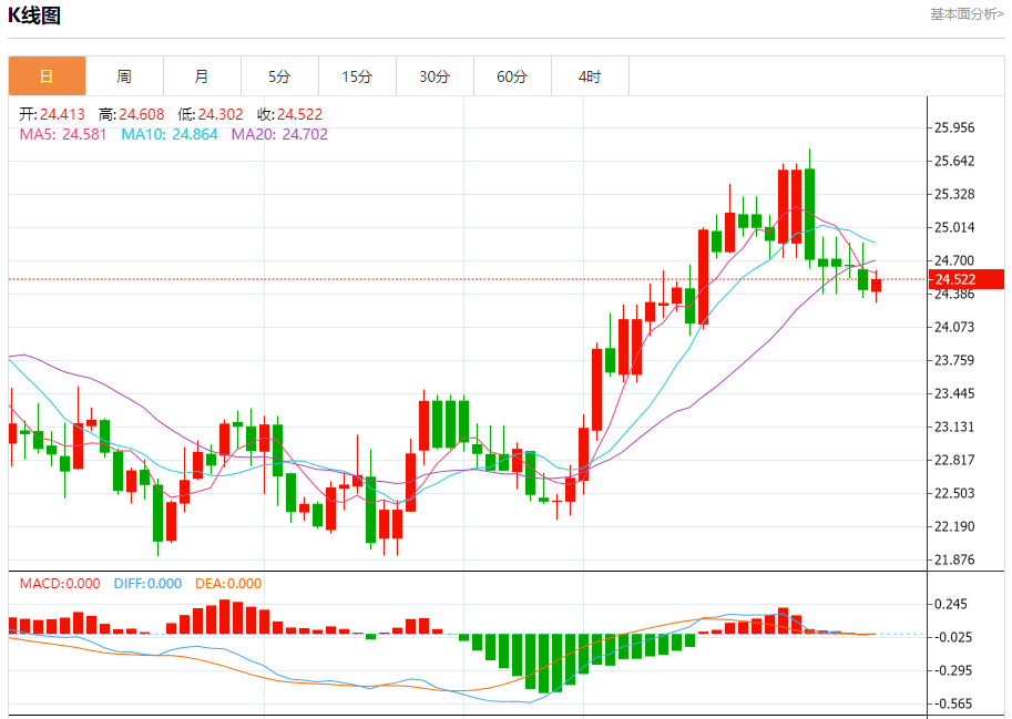 现货白银:截止北京时间20:25,现货白银上涨,现报24.515,涨幅0.35%。纽市盘前,白银价格测试了24.30美元的关键支撑位,并从那里强劲反弹。保持在这一支撑和24.85美元阻力所代表的趋势关键之间。
