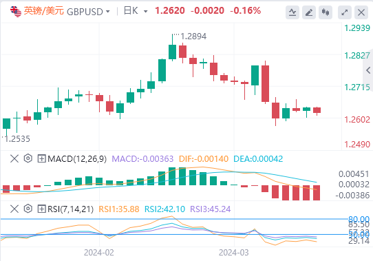 欧元:截止发稿,欧元/美元徘徊于1.0815附近。欧元/美元周四下跌,收报1.0827,跌幅0.04%。欧洲央行首席经济学家菲利普-莱恩(Philip Lane)周二表示,工资通胀率这一欧洲央行密切关注并为其政策提供指引的指标,正在“按计划” 恢复到正常水平。技术面上,欧元/美元由于交易员对欧元区经济景气报告做出反应,基本持平。报告显示,经济景气指数从2月份的95.5改善至3月份的96.3,而分析师普遍预期为96.3。如果欧元/美元收于最近的支撑位1.0810–1.0830下方,它将走向下一个支撑位1.0700–1.0720。