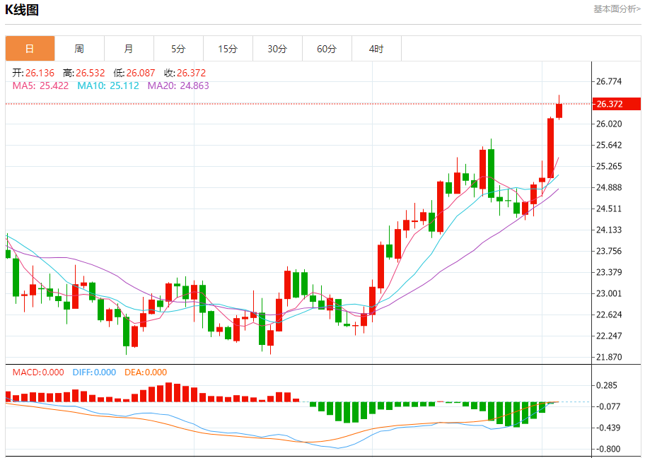 现货白银:截止北京时间20:26,现货白银上涨,现报26.381,涨幅1.02%。纽市盘前,白银价格今天上午提供了额外的积极交易,接近我们期待的新目标26.60美元。然而,价格在失去积极势头后正在下降,经历了一些暂时的看跌修正。