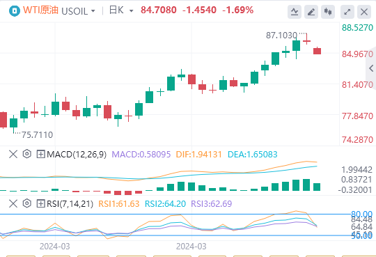 周一亚盘,原油交投于84.70附近。,油价下跌1%,原因是以色列从加沙南部撤出更多士兵,同时,以色列和哈马斯派出团队前往埃及,就开斋节前可能达成的停火协议进行新一轮谈判,从而缓解中东地区的紧张局势。全球最大的石油出口国沙特阿拉伯上周上调对亚洲所有原油等级的官方售价,符合市场预期。