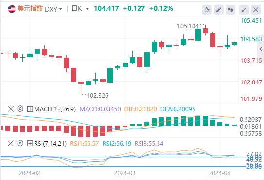 美元指数:截止发稿,美元指数交投于104.417附近。强劲的劳动力市场前景,好于预期的3月份非农就业报告凸显了强劲的劳动力市场前景,巩固了美元的看涨前景。话虽如此,美联储(Fed)6月降息的可能性仍然很高且稳定。技术面上,美元指数表明相对强弱指数(RSI)呈积极倾向。RSI目前在正值区域表现出正斜率,这与看涨力量在近期情况下对抛售压力的主导地位相呼应。与此同时,移动平均收敛散度(MACD)尽管具有平坦的绿色条,但仍支持看涨前景。