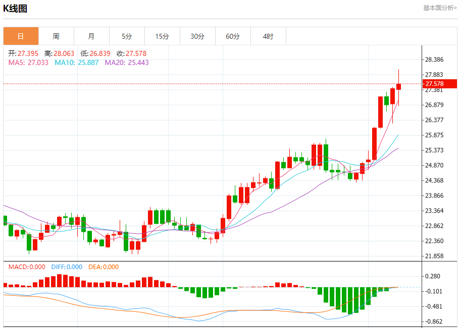 现货白银:截止北京时间20:25,现货白银上涨,现报27.564,涨幅0.50%。纽市盘前,白银价格今天上午强劲上涨,成功触及我们等待的目标28.00美元,我们认为实现进一步上涨的道路是开放的,目标是28.75美元水平作为下一个积极站。