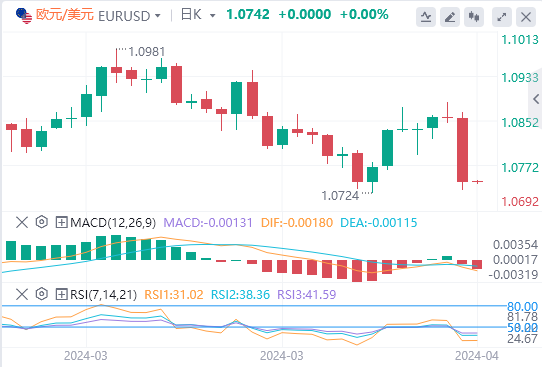 英镑:截止发稿,英镑/美元徘徊于1.2541附近。英镑/美元周三下跌,收报1.2540,跌幅1.08%。市场维持美联储将减少降息次数的预期引发市场美元受到追捧,美元指数创下了今年迄今新高。英镑/美元继触及1.2708的高点后交投于1.2534。技术面上,汇价上行的初步阻力位于1.2659,进一步阻力位于1.2777,关键阻力位于1.2847;汇价下行的初步支撑位于1.2471,进一步支撑位于1.2401,更关键支撑位于1.2283。