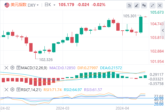 美元指数:截止发稿,美元指数交投于105.179附近。在3月份重磅的劳动力市场报告和火热的通胀数据之后,美联储官员可能会开始发出信号,他们需要经济降温的额外证据。从这个意义上说,美国国债收益率可能会继续上升,这将有利于美元。技术面上,美元日线图上的技术指标反映出买家正在获得动力。相对强弱指数(RSI)呈正斜率,完全在正区域内,这暗示了潜在的看涨力量。