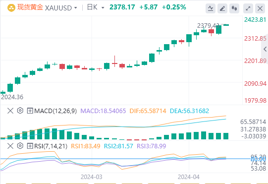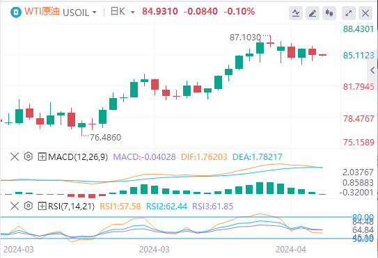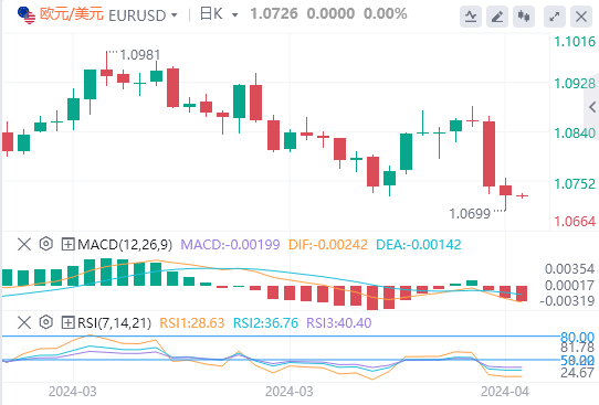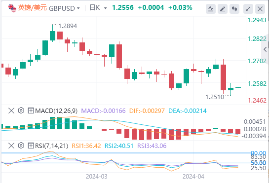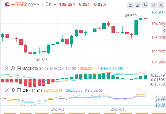 美元指数:截止发稿,美元指数交投于105.254附近。美元周四在震荡交易中基本持平,美国3月PPI增幅低于预期,未缓解人们对通胀持续的担忧,官员们也重申必须采取耐心的方式来放宽货币政策。技术面上,日线图上的技术指标反映了美元指数的看涨势头。相对强弱指数(RSI)在正区域呈正斜率,表明存在潜在的购买动力。此外,移动平均线收敛分歧(MACD)似乎证实了这一看涨前景。它显示了不断上升的绿色条,增强了市场看涨情绪的信心。