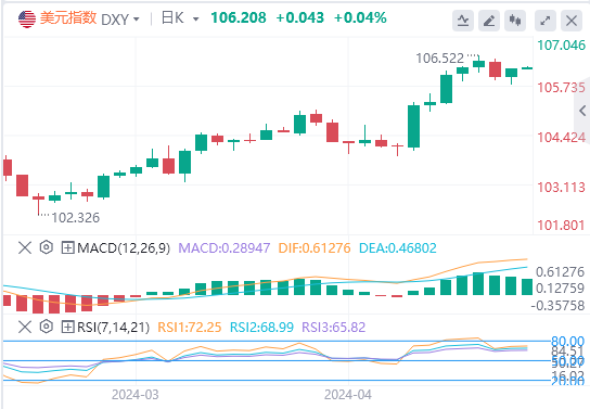 美元指数:截止发稿,美元指数交投于106.208附近。美国经济保持韧性,显示出顽固的通胀和经济强劲。这使得美联储采取了更鹰派的信息,市场正在推迟宽松周期的开始。技术面上,日线图上的指标反映了对美元指数的积极偏差。相对强弱指数 (RSI) 具有正斜率,舒适地处于正区域。这意味着潜在的看涨势头。与这种看涨偏见相辅相成的是移动平均收敛散度 (MACD),它显示上升的绿色条,有助于整体购买情绪。