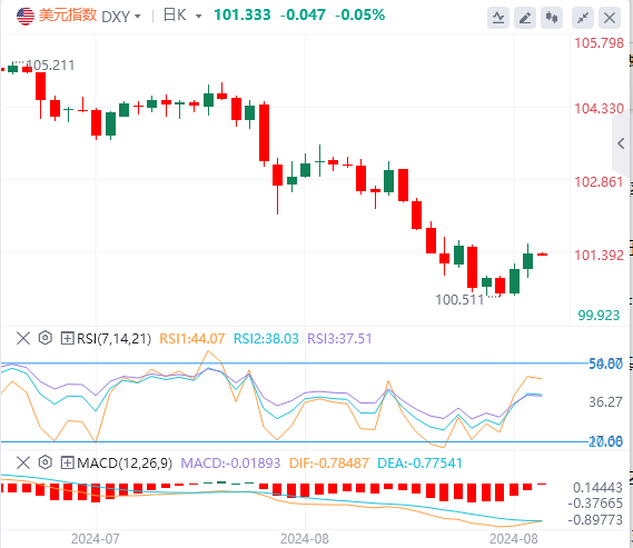 8月30日,北京时间周五亚市早盘,美元指数徘徊在101.33附近。周四,因美国第二季度GDP环比增长年率高于预期、初请失业金人数下降,美元指数延续昨日涨势,最终收涨0.34%,报101.38。基准的10年期美债收益率收报3.8650%;对货币政策更敏感的两年期美债收益率最终收报3.9020%。现货黄金在强劲的美国经济数据公布后一度跳水,触及2504,但因鲍威尔曾暗示美联储9月将降息的可能性,黄金“深V”反弹,最终收涨0.68%,报2521.00美元/盎司。现货白银最终收涨1.15%,报29.44美元/盎司。因消息人士称伊拉克将在9月份降低产量和出口量,国际油价大涨。WTI原油最终收涨2.18%,报75.95美元/桶;布伦特原油最终收涨1.76%,报78.75美元/桶。