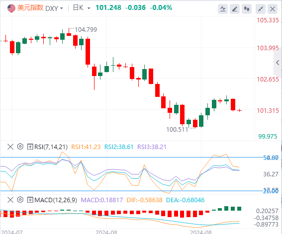 9月5日,北京时间周四亚市早盘,美元指数徘徊在101.24附近。周三,因美国7月JOLTs职位空缺数据低于预期,美元指数一度跳水近50点,最终收跌0.50%,报101.26。基准的10年期美债收益率收报3.7590%;对货币政策更敏感的两年期美债收益率最终收报3.7740%。现货黄金于欧盘期间持续走弱,但在职位空缺数公布后收复失地,最终收涨0.09%,报2494.80美元/盎司。现货白银最终收涨0.76%,报28.26美元/盎司。因利比亚石油供应问题有望解决和市场对美国石油需求量的担忧,国际油价延续昨日跌势。WTI原油收跌1.37%,报69.17美元/桶;布伦特原油最终收跌1.30%,报72.72美元/桶。