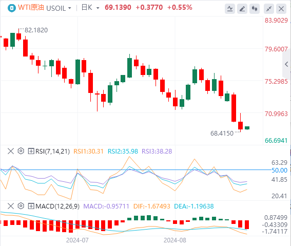周四亚盘,原油交投于69.13附近。由于未来几个月石油需求前景消极,WTI价格仍面临抛售压力,并触及2023年12月13日以来的最低水平。石油输出国组织及其盟友(OPEC+)正在讨论推迟原定于10月开始的石油增产,因为预计利比亚产量将增加。“由于需求增长不确定,而且不太可能出现重大供应中断,所有人的目光都再次集中在欧佩克+身上,”RystadEnergy高级分析师SvetlanaTretyakova表示。