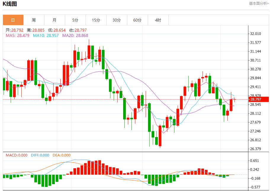 现货白银:截止北京时间20:25,现货白银下跌,现报28.799,跌幅0.01%。纽市盘前,银价仍然停留在28.55美元支撑位和29.30美元阻力位之间,这使我们保持中立直到现在,等待超过其中一个水平,以明确检测下一个目标。
