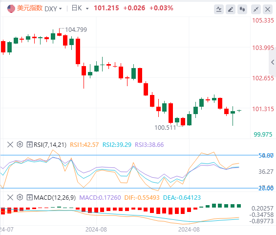 9月9日,北京时间周一亚市早盘,美元指数徘徊在101.21附近。上周五,美元指数震荡上行,并在非农数据公布后上下大幅波动,最终站稳在101关口上方,收涨0.13%,报101.18。基准的10年期美债收益率收报3.713%;对货币政策更敏感的两年期美债收益率最终收报3.654%。因美国就业数据好坏参半令市场对美联储本月稍晚的降息幅度产生疑虑。现货黄金在非农数据公布后一度冲上2529.10美元的日内高点,而后回吐全部涨幅并转跌,最终收跌0.76%,报2497.56美元/盎司。现货白银大跌超3%,最终收跌3.07%,报27.92美元/盎司。或因市场对经济衰退的担忧抵消了欧佩克+推迟增加供应对油价的支撑,国际油价日内跌超1%,一度跌至去年6月以来最低水平。WTI原油一度跌至66.70美元的日内低点,最终收跌1.84%,报67.62美元/桶;布伦特原油最终收跌1.86%,报71.34美元/桶。值得注意的是,布伦特原油上周下跌10%,WTI原油上周下跌约8%。