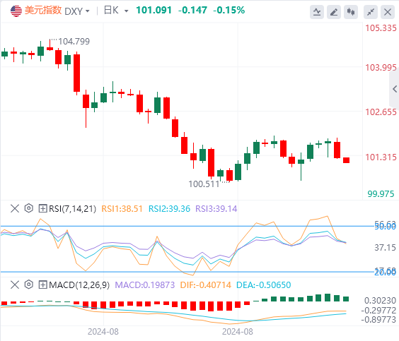 美元指数:截止发稿,美元指数交投于101.09附近。尽管经济指标积极,但目前的市场估值可能过于乐观。最近的数据显示,美国经济仍然强劲,以超出预期的速度扩张。技术面上,美元指数正试图收于50MA下方101.48。如果这次尝试成功,它将朝着100.80–101.00的支撑位前进。
