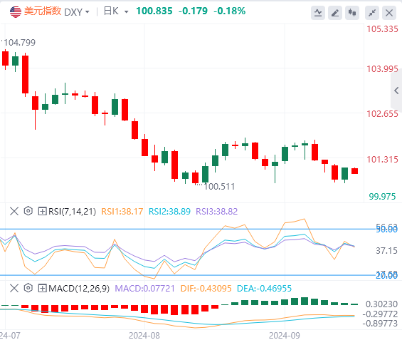 9月18日,北京时间周一亚市早盘,美元指数徘徊在100.83附近。周二,因“恐怖数据”好于预期,这可能支持美联储以25个基点的步伐开启降息周期,美元指数在美盘前有所反弹,并回升至101关口,最终收涨0.34%,报101。美债收益率小幅上行,基准的10年期美债收益率收报3.659%;对货币政策更敏感的两年期美债收益率收报3.615%。因美元和美债收益率走高,现货黄金震荡下行,并在美盘时段一度跌至2560.77美元的日内低点,较日高大跌近30美元,最终收跌0.5%,报2569.58美元/盎司。现货白银区间震荡,最终收跌0.12%,报30.68美元/盎司。国际油价延续反弹。WTI原油在美盘前一度跌至68.50美元的日内低点,而后迅速回升,收复日内全部失地并转涨,最终收涨0.8%,报69.91美元/桶;布伦特原油收涨0.89%,报73.17美元/桶。