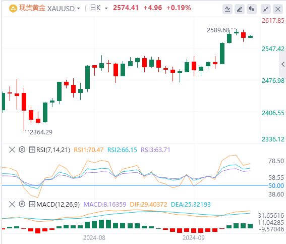 周一亚盘,黄金交投于2574.41附近。在美联储周三做出货币政策决定之前,黄金价格几乎没有变化,因为美元在强劲(相对于市场普遍)的8月美国零售销售报告后出现反弹。因此,美国国债收益率上涨,美元小幅走高,限制了黄金的上行空间。根据CMEFedWatchTool的数据,对美联储将借贷成本降低50个基点(bps)的预期仍为63%,而降息25个基点的可能性为37%。