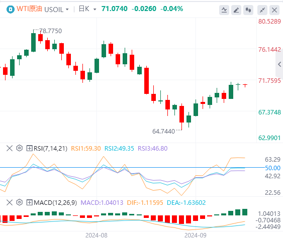周一亚盘,原油交投于71.07附近。在美联储大幅降息50个基点后,石油市场受到提振。这一举措超出了预期,预计将通过降低借贷成本来刺激经济增长,从而可能增加能源需求。美国原油库存降至一年来的最低水平,上周库存减少160万桶。飓风弗朗辛(HurricaneFrancine)之后的供应中断加剧了这一下降,飓风减少了原油产量和从墨西哥湾的进口。供应趋紧,加上美联储降息,帮助油价从近期低点回升,推动布伦特原油和WTI本周分别上涨5.31%和4.02%。