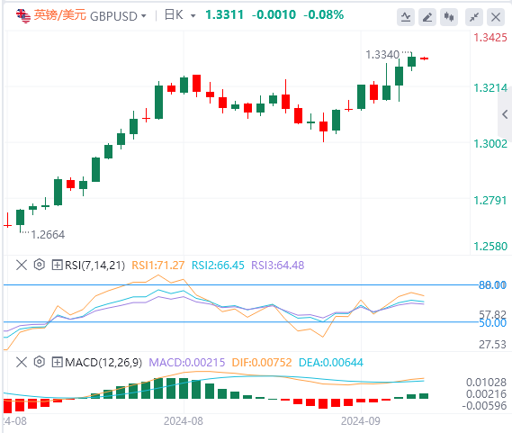 英镑:截止发稿,英镑/美元徘徊于1.33111附近。英镑/美元上周五上涨,收报1.3322,涨幅0.29%。英镑/美元上周表现优于风险货币,自2022年2月以来首次升至1.3300上方,原因是市场对风险货币的偏好增加、英国央行谨慎按兵不动以及英国数据强劲。标普全球制造业和服务业采购经理人指数将于9月23日公布,同时公布的还有CBI工业趋势订单。9月26日将公布汽车产量数据,9月27日将公布CBI批发零售业数据。技术面上,如果英镑/美元攀升至1.3350水平上方,它将朝着阻力位1.3420–1.3440前进。