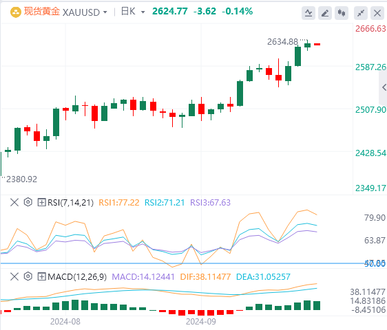 周二亚盘,黄金交投于2624.77附近。黄金价格周一小幅上涨,触及2630美元以上的历史新高,原因是市场对美联储(Fed)将在11月降息的押注增加。来自美国(US)的数据喜忧参半。S&PGlobal公布了其PMI初值,为制造商描绘了黯淡的前景,而服务业尽管与8月份的数据相比略有放缓,但仍保持弹性。