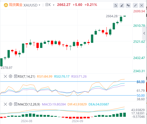 技术面:黄金/美元向上倾斜,将继续创下历史新高,尽管涨势似乎过度延长,交易员将目光投向2700美元。即使相对强弱指数(RSI)已转为超买,动量也有利于买家。因此,买家应警惕可能会出现回调。如果黄金延续涨势,交易者可能会测试2675美元,然后是2700美元。接下来是2750美元的水平,然后是2800美元。另一方面,如果黄金跌破2650美元,请测试9月18日的日高点2600美元。以下需要测试的关键支撑位将是9月18日的低点2546美元,然后是50天简单移动平均线(SMA)2481美元。