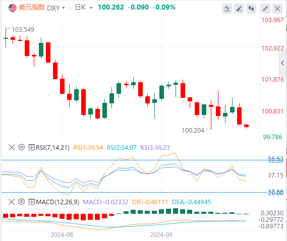 9月25日,北京时间周三亚市早盘,美元指数徘徊在100.26附近。周三,美国消费者信心大幅下滑令美元指数承压,最终收跌0.584%,报100.35。美债收益率集体走低,基准的10年期美债收益率收报3.733%;对货币政策更敏感的两年期美债收益率收报3.548%,创近两年收盘新低。受中国刺激政策的提振,离岸人民币兑美元涨近500点,剑指7.0关口。随着美联储降息的前景和中东紧张局势助长贵金属的吸引力,现货黄金连续3日创下新高,盘中最高触及2664.28美元/盎司,最终收涨1.08%,报2656.67美元/盎司。现货白银同样大爆发,日内涨幅一度达到5%,最终收涨4.58%,报32.1美元/盎司。由于中国刺激政策提振了市场对原油需求前景的信心以及地缘局势风险溢价仍存,国际原油反弹。WTI原油一度站上72美元/桶,最终收涨1.19%,报71.38美元/桶;布伦特原油收涨1.27%,报74.49美元/桶。
