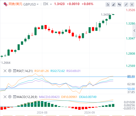 英镑:截止发稿,英镑/美元徘徊于1.3423附近。英镑/美元上周二上涨,收报1.3413,涨幅0.49%。周三因美元全盘疲软后英镑兑美元连续第二天延续持续涨势,突破1.3400关口,并刷新30个月高点。美元全盘疲软恰恰给了英镑维持当前牛市动能所需的动力。周三,英镑方面的经济数据将表现平静,不过英镑交易商将密切关注英国央行(BoE)货币政策委员会(MPC)委员梅根-格林(MeganGreene)的演讲。货币政策委员会委员格林将在英国东北商会发表演说。技术面上,从技术角度来看,英镑/美元正朝着阻力位1.3420–1.3440迈进。