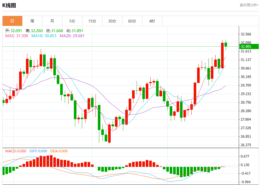 现货白银:截止北京时间20:28,现货白银下跌,现报31.882,跌幅0.60%。纽市盘前,白银价格以明显的利空交易至32.00美元下方,而只要31.00美元水平保持不变,主要的看涨趋势仍然活跃,等待收集积极的动力,以帮助推动价格恢复看涨趋势,其目标从32.50美元开始,并延伸至33.00美元,作为下一个主站。