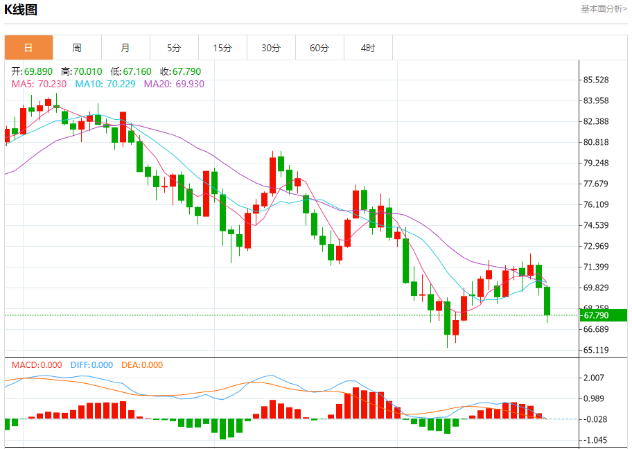 原油市场:截止北京时间20:25,美油下跌,现报67.780,跌幅2.76%。纽市盘前,原油价格强势突破70.44美元水平,直接达到68.55美元水平,暗示未来几个交易日将进一步下跌,注意到突破最后一个水平将为下一个负站67.20美元开辟道路。