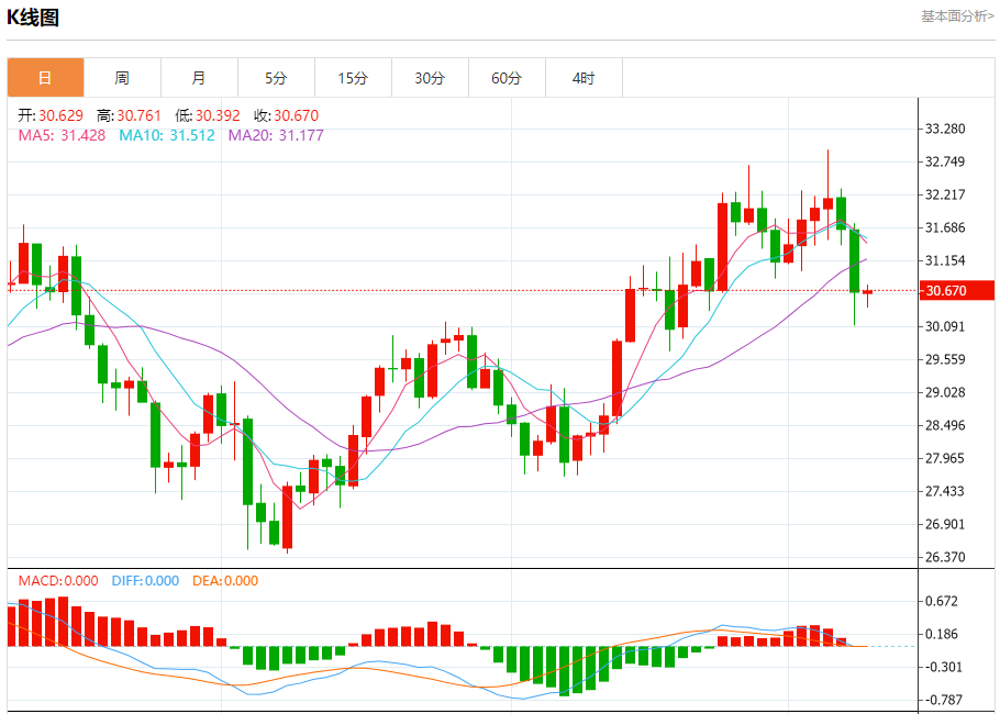 现货白银:截止北京时间20:20,现货白银上涨,现报30.668,涨幅0.06%。纽市盘前,白银价格继续在30.50美元附近波动,只要价格低于31.00美元,我们的看跌观点今天仍然有效,受到EMA50形成的负压的支持,提醒您我们的目标是从突破30.06美元开始,以确认下一站向29.30美元前进。