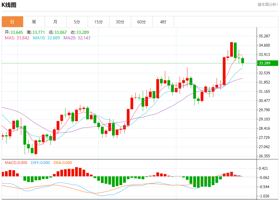 现货白银:截止北京时间20:23,现货白银下跌,现报33.278,跌幅1.12%。纽市盘前,白银价格恢复其负面交易,以接近我们第一个等待的目标33.04美元,并且似乎有可能超过这一水平并实现其他负面目标32.50美元,以保持熊市趋势在当天剩余时间内有效和活跃,提醒您熊市波的持续取决于33.70美元以下的价格稳定性。